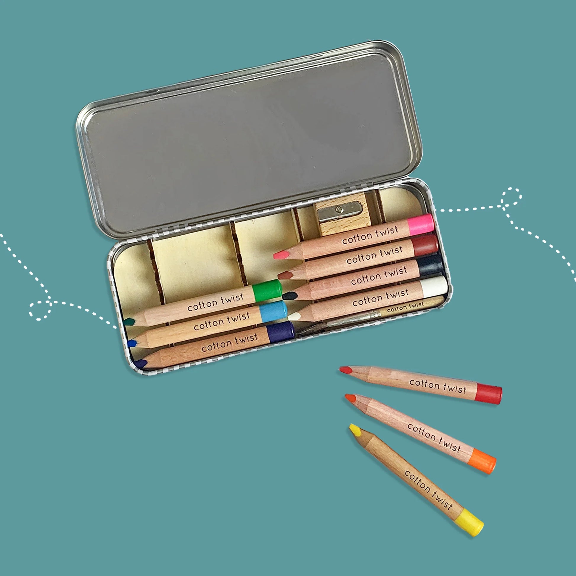 Disse akvarellblyantene fra Cotton Twist er et sølefritt alternativ til maling og 100 % plastfritt. Hver boks onneholder til akvarellfarger i regnbuefargene, i tillegg til brun, hvit og svart farge. Esken inneholder også en blyantspisser og malepensel.